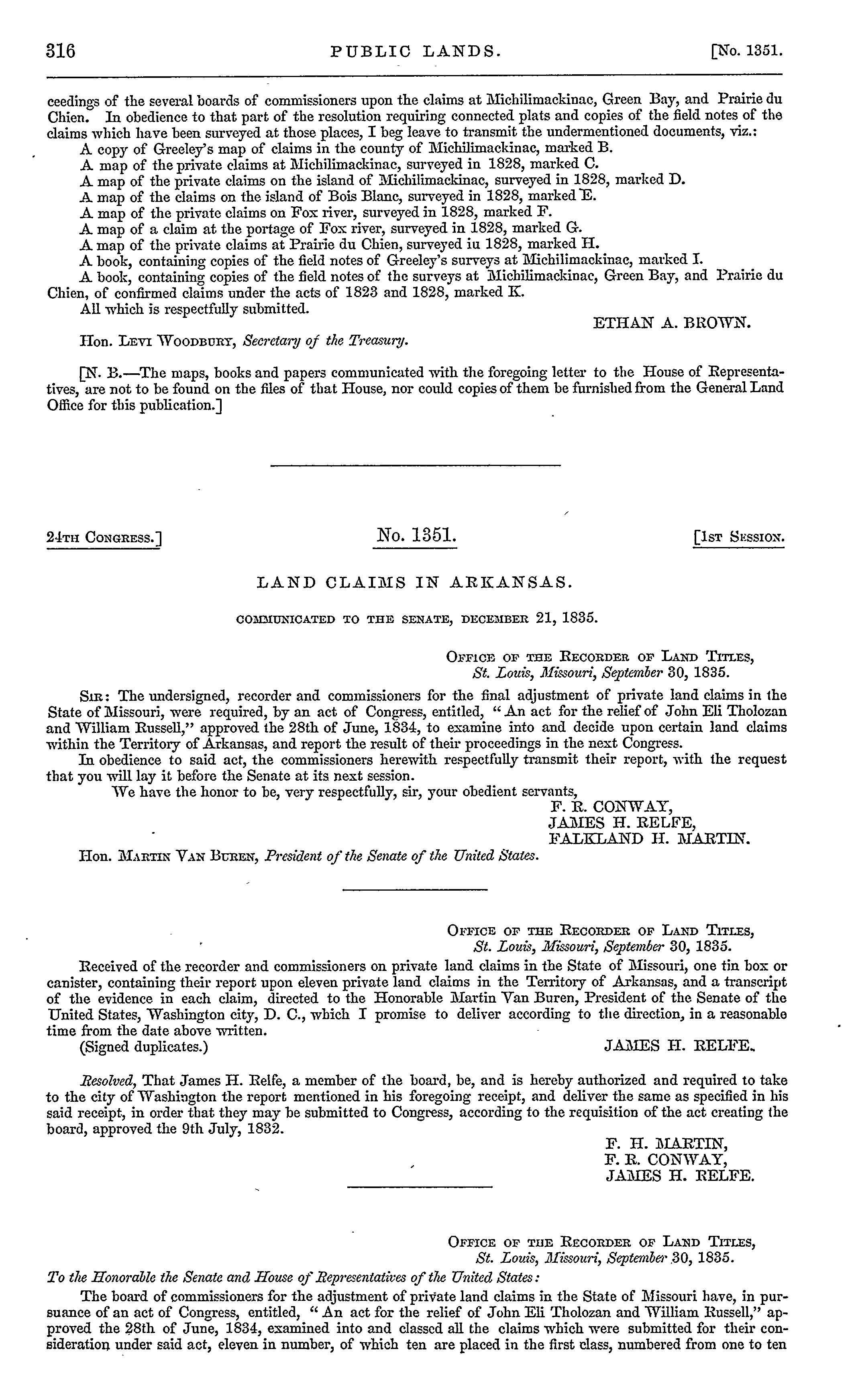 1835, Green Bay Claims, Listing Maps & Books, American State Papers